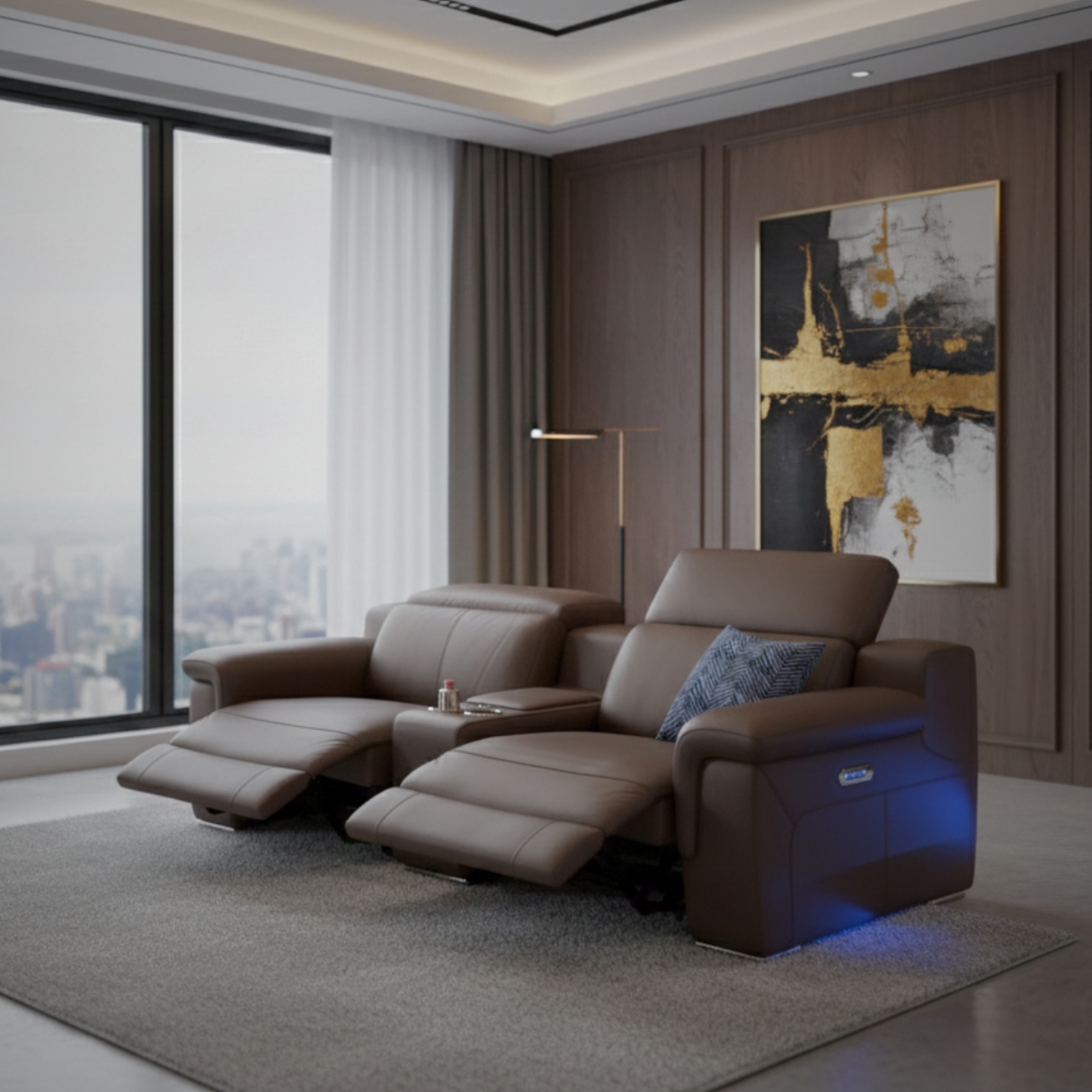 Εξαιρετικά μοντέρνο σχέδιο με 2 καθίσματα και πλάτες με ηλεκτρικό relax / ανάκλιση. Τα υποπόδια και οι πλάτες ρυθμίζονται πλήρως με ηλεκτρικό μηχανισμό ανάκλισης. Ο Big Relax διατίθεται επίσης και σε έκδοση με μια κεντρική μονάδα που αποτελείται από 1 κουτί αποθήκευσης και δύο θήκες για μπουκάλια. Ο ιδανικός καναπές για home cinema. Διαθέτει ξύλινα πόδια.